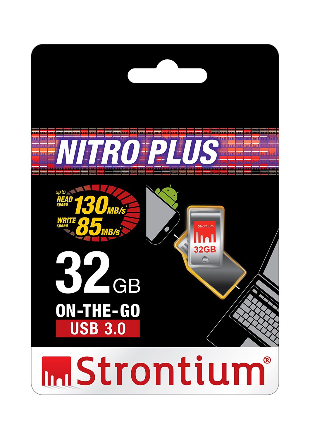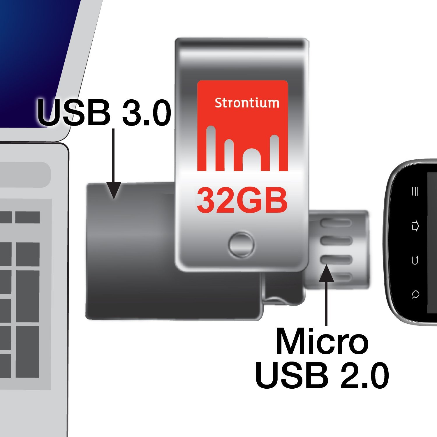 Strontium On-The-Go (OTG) USB 3.0 Blazing Speed flash drive can store and share digital contents such as movies, pictures, and music from your OTG supported devices like smartphones or tablets to your PC or Mac computer with amazing transfer speed using its dual micro-B and standard Type A USB 3.0 connectors. Data storage and transfer between OTG-compatible devices (smartphones, tablets and PC) with amazing performance. With up to Read 120MB/s and Write 90MB/s transfer speed, Strontium 64GB OTG 3.0 drive is one of the fastest OTG drive in the market and transfer files up to ten times faster than standard OTG 2.0 drives.Equipped with both a micro-B & standard USB 3.0 dual connector.With Strontium OTG drive’s Standard Type A USB 3.0 connector — compatible with USB ports equipped in traditional PCs and backwards compatible with USB 2.0 — storing and sharing music, photos, or videos is rapid and easy. Strontium OTG drive’s micro-B connector means that data and files can be conveniently downloaded to and from your smartphones or tablets PC.Expansion solution for your smartphones and tablets.